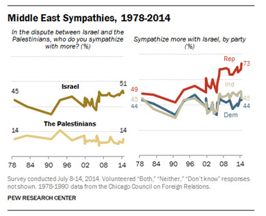 Historically, political polarization has increased markedly on one of the most basic polling measures with respect to support for Israel. In July 2014, by a margin of 73 percent to 44 percent, Republicans were more apt than Democrats to say they are sympathetic to Israeli rather than the Palestinians in the Middle East conflict. When this question was first asked in the late 1970s, about equal numbers of Republicans and Democrats said they were more pro-Israel: 49 percent and 44 percent, respectively. The pro-Israel partisan gap widened substantially in the last decade following the 9/11 attacks as Republicans became much more likely to back Israeli over the Palestinians while Democratic opinion changed little.