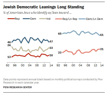 While most Jews are indeed strong backers of Israel, the polling data suggests that the generally liberal ideology of Jewish Americans continues to align with their long-standing affinity to the Democratic Party. In the Pew Research Center’s 2014 aggregate surveys, 41 percent of Jewish respondents described themselves as liberals, compared with 24 percent of the public at large.