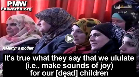Palestinian women are often shown ululating - sounding cries of joy - over their "martyred" relatives.Mothers in particular are often shown expressing joy over their sons' Martyrdom-deaths. Palestinian Media Watch reported on the mother of one of the two terrorists who brutally murdered 5 in a synagogue in Jerusalem last year. The mother was shown reciting a poem honoring the dead killers while receiving guests in her mourning tent. During her recital, ululations were heard.