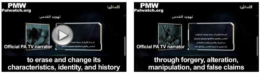 Official PA TV narrator: "The Judaization of Jerusalem - a concept meaning all of the Israeli occupation's attempts... to erase the Arab Islamic identity and change the Arab Islamic characteristics that represent the true cultural face of the occupied Arab city of Jerusalem, and to stamp it with a new fictional character that is called the Jewish character... History does not recall that any city has been subjected to attempts to erase and change its characteristics, identity, and history through forgery,alteration, manipulation, and false claims in the way that the city of Jerusalem is subject to them."