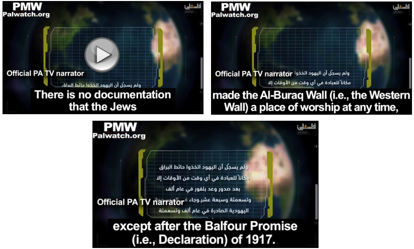 A narrator on official PA TV claimed that all of the Temple Mount "belongs to Muslims," denying the Western Wall was ever a "place of worship" for Jews before the Balfour Declaration of 1917, which expressed Britain's support for creating "a national home for the Jews in Palestine":
